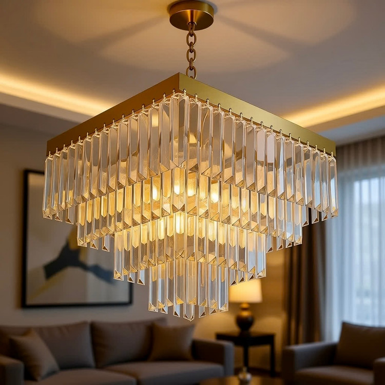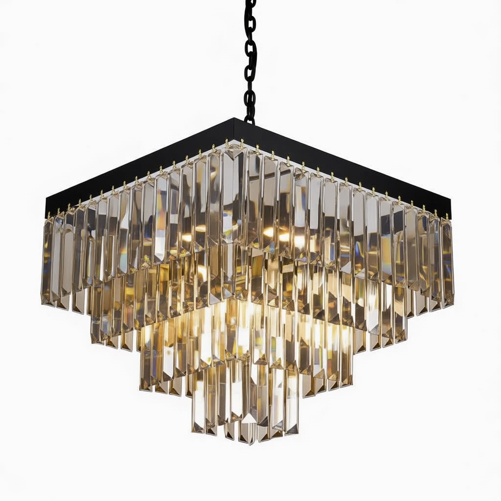 این لوستر با ساختار مربعی و چینش چندلایه کریستالها، جلوهای باشکوه و در عین حال مدرن به فضا میدهد.
